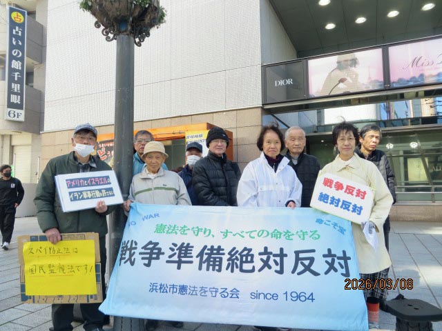 〔今年も23.9.21 エアフェスタの廃止申し入れ〕 今年も危険なエアフェスタ浜松が10月に行われるとの報に接し、今年も「憲法を守る会」と「社民党浜松総支部」共同で9月21日航空自衛隊浜松基地を訪れ、恒久的廃止要望書を提出しました。 全文詳細は、「私たちの主張」タグをクリックしてご覧下さい。 ![]() ![]() 〔22.9.16 エアフェスタの恒久的廃止を申し入れ〕 二年間コロナ感染拡大のため中止になっていた浜松基地航空祭(エアフェスタ)は、今年は行われるとの発表を受け、9月16日、 この催しの恒久中止を求める請願書を自衛隊浜松基地・熊谷三郎司令に提出しました。請願書全文は「私たちの主張」タグをクリックしてご覧下さい。 ![]() 【2022年度総会が開催されました】 2022年度の総会が、6月12日午後2時より遠州教会集会室で開催され、2021年度の活動記録、活動総括、2021年度会計決算報告、監査報告、2022年度活動計画、2022年度会計予算等、執行部提出議案は、一部修正の後、すべて承認されました。引き続き会員の皆様のご協力をお願い申し上げます。 〔12/21 川勝平太 静岡県知事へ要望書を送りました〕 川勝知事が今年秋の静岡護国神社例大祭に公用車を使って出席し、玉串拝礼を行っていたことが、報道で報じられました。これは政教分離を謳った憲法第20条に違反する可能性は極めて濃厚です。当会は、これを看過すべきではないと判断し、本日以下添付の要請書を配達証明付き郵便で送付しました。以下に添付します。これに、知事がどう反応するか来年の例大祭は、当会は出向き確認する予定です。 ![]() 〔当会常任委員高橋博氏ご逝去のお知らせ〕 ★かねて呼吸器の病のため入院されていた常任委員高橋博氏が2021年9月17日、お亡くなりになりました(88才)。高橋氏は憲法を守る会発足当時から、会員としてまた代表委員として、献身的に多大な貢献をされました。心から感謝を申し上げるとともに、深く哀悼の意を表します。 〔高橋博氏の在りし日のお姿は、このページの中程、2017年12月18日付け中日新聞「平和の俳句」に載っております〕 -------------------------------------------------------------------------------------- 〔今年もエアフェスタの恒久的廃止を自衛隊浜松基地に申し入れました〕 この件、役員会で5月頃から討議され、今年も中止を申し入れする事にしていましたが、昨年に引き続き今年も新型コロナウイルス感染拡大を理由に、中止となることが、自衛隊浜松航空基地ホームページで発表されてました。中止理由が、私達の主張と異なることは残念ですが、ともあれ今年も中止となり、良かったと思います。これを機に、この様な催し(国民の印象操作)は恒久的に中止する事を求め、2021年9月28日、航空自衛隊浜松基地・熊谷三郎司令に請願書を提出しました。私たちの税金で行われているこの催しに費やされるお金を、これからは、コロナ対策や貧困対策等に回すこともあわせて求めて行きます。 ![]() |