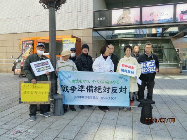 毎月第2日曜日午後1時、浜松市役所正面玄関前に集まり、小集会を行った後、浜松中央郵便局前まで護憲平和を訴え、チラシを配りながら平和行進を行っています。